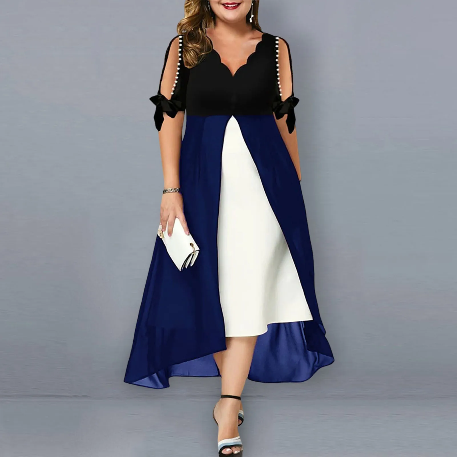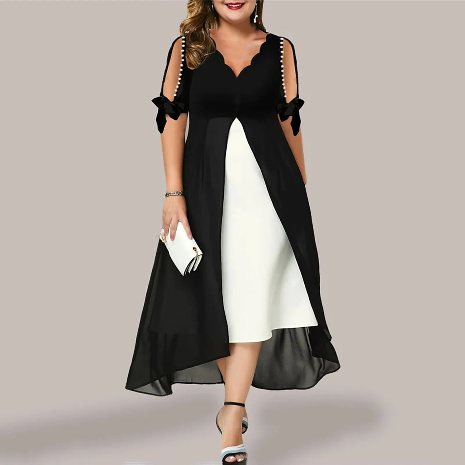 Features: Faux Pearls Decor, Cold Shoulder, Fake Two Pieces