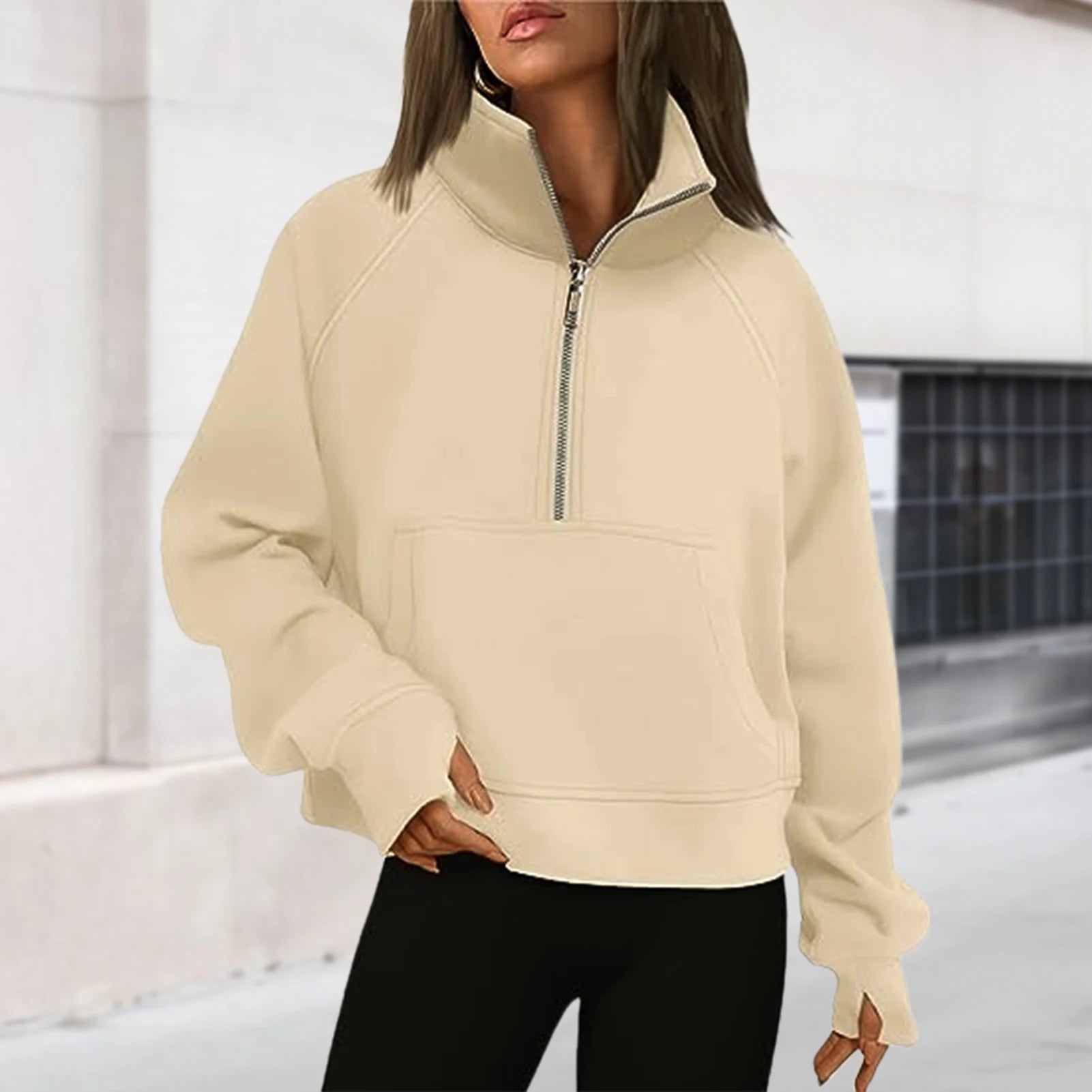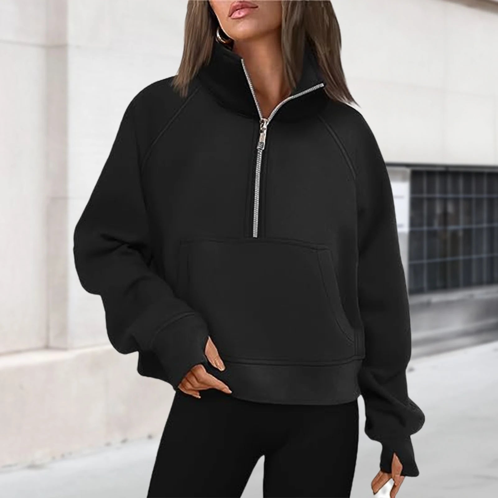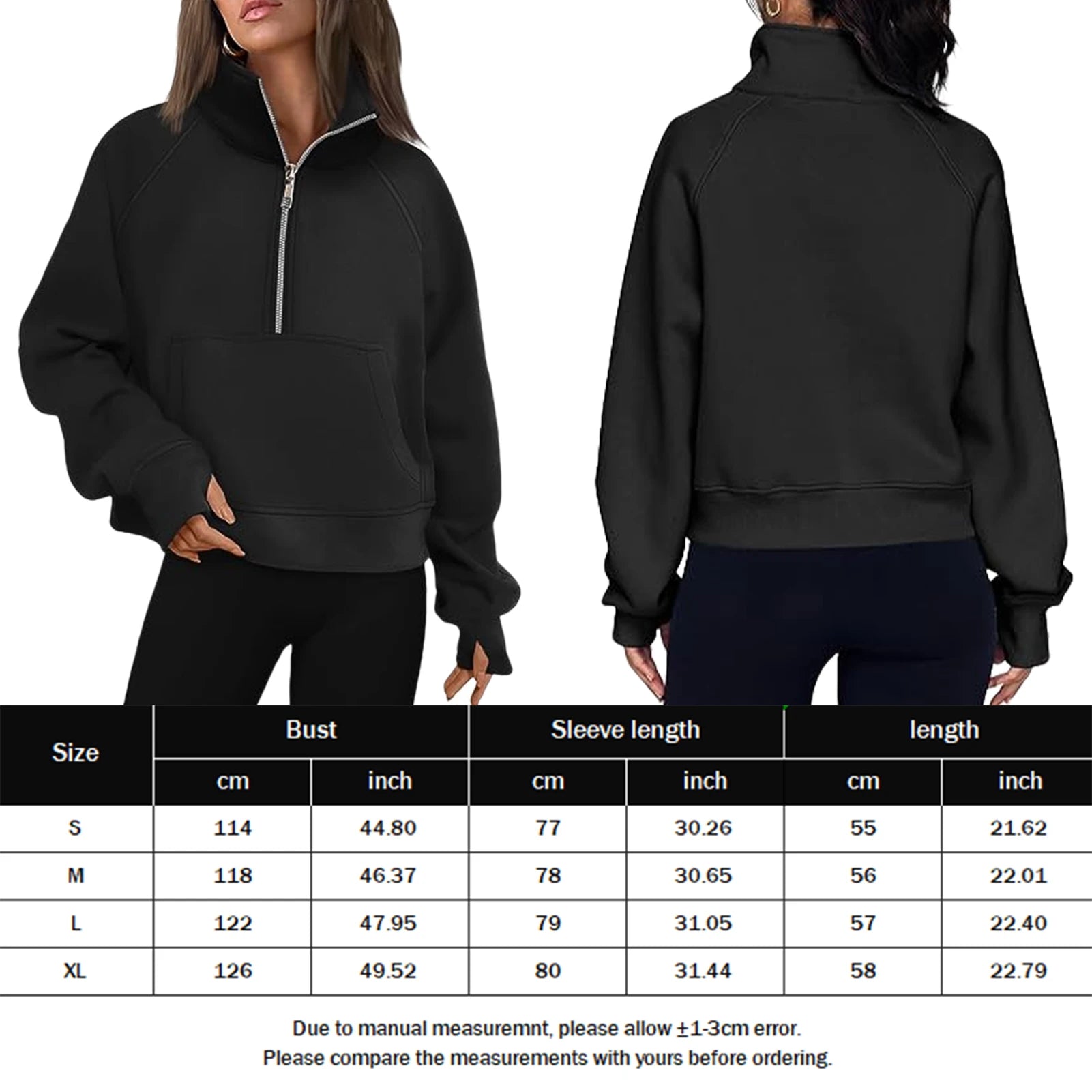 Stand Collar Casual Sweatshirts Half Zip Women Cropped Pullover Thumb Hole Overzised Hoodie Solid Color Plus Size Sports Outfit